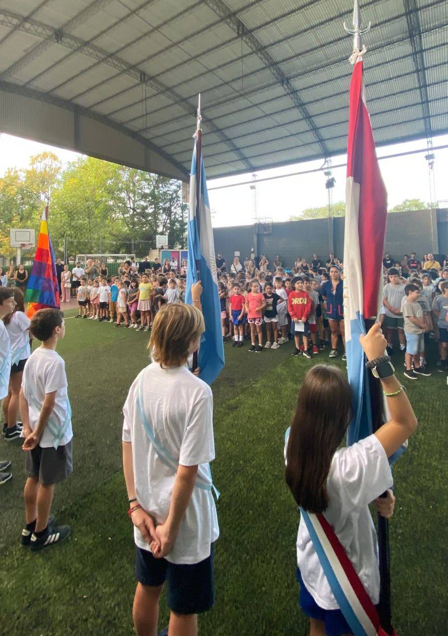 Profesores de Educación física organizaron una conmemoración por los 44 años, recordando a veteranos y caídos por la guerra en Islas Malvinas. Docentes expresaron unas palabras y compartieron en el cierre una canción de Lerner, “Aquellos otros”, que fue acompañada con atención y entusiasmo por los/as estudiantes.
